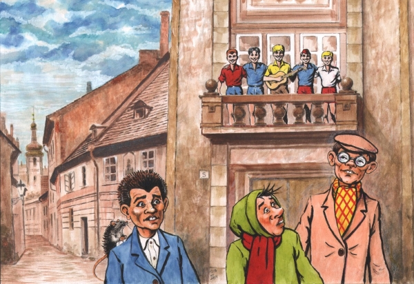 My jsme dnes z barevného i černobílého světa dobrodružství, fantazie i skutečnosti Karla Zemana vybrali kresbu Bratrstva kočičí pracky pod balkonem s fischerovskými figurami Rychlých šípů. Jak také jinak, když právě dnes začala měsíční pátrací hra Hledáme Rychlé šípy.